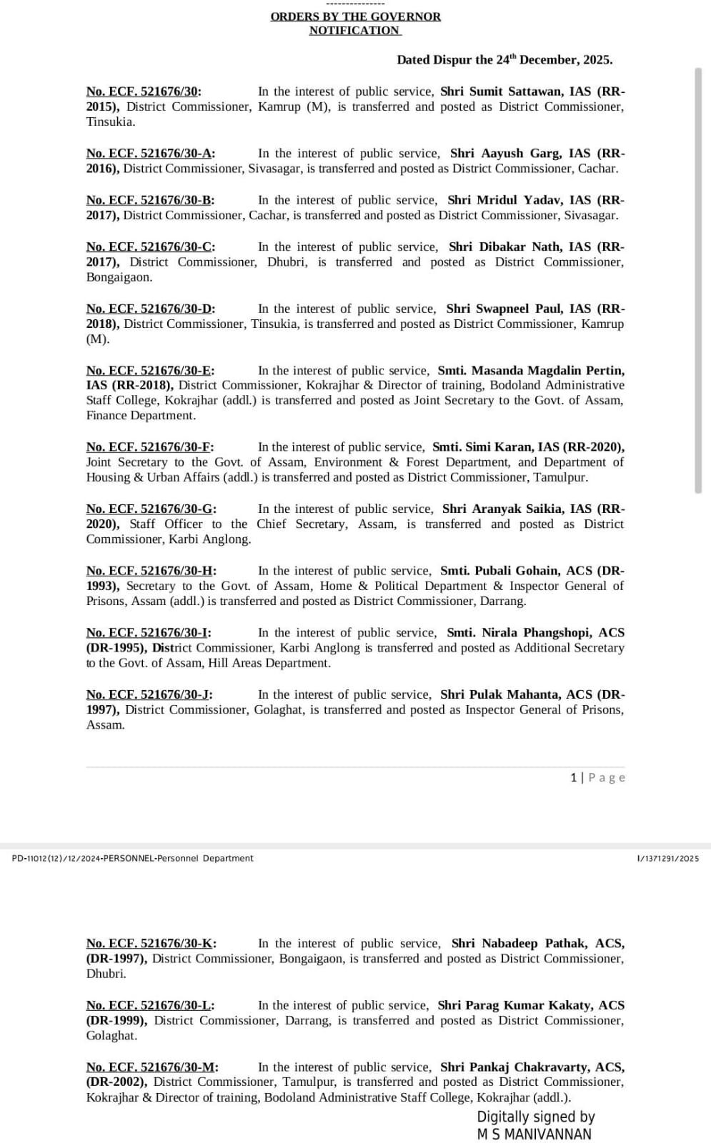 Eight DC level IAS officers belonging to various batches have been reshuffled in Assam Government. Notably, OSD of Assam Chief Secretary Arnayak Saikia IAS: AM: 2020 batch has been transferred as District Commissioner Karbi Anglong.