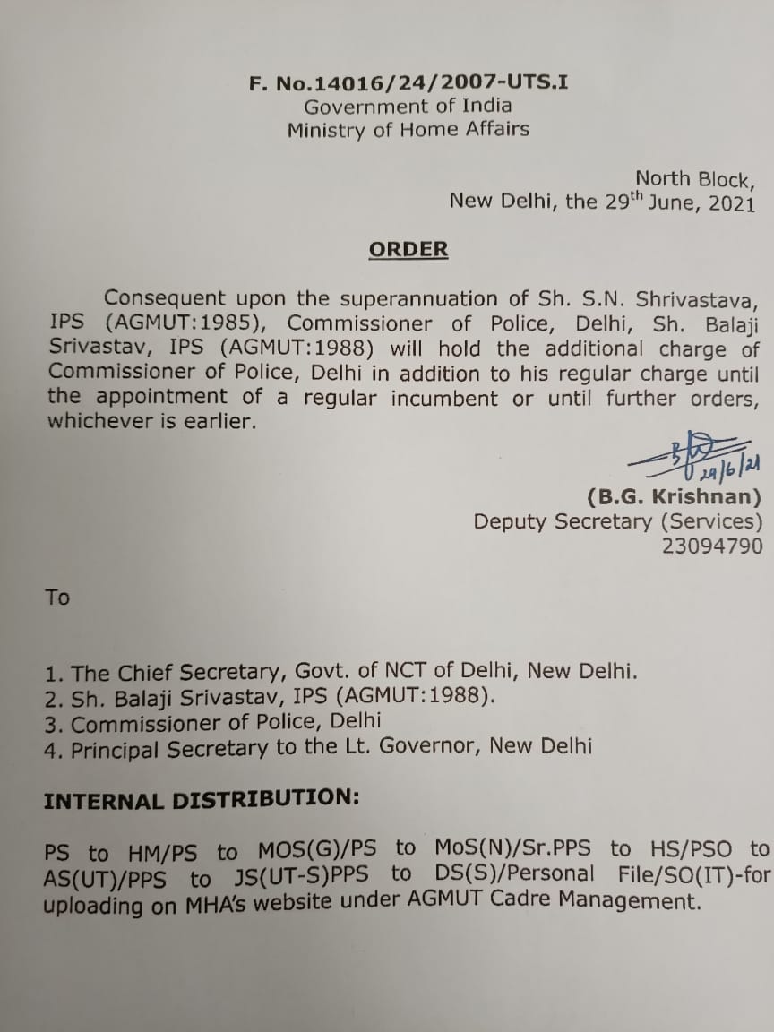 Balaji Srivastava IPS officer AGMUT 1988 batch, who is presently posted as Special Commissioner, Vigilance, Delhi Police has been given additional charge of Commissioner of Delhi Police by the Ministry of Home Affairs, Government of India. The official order has been issued by the competent autho